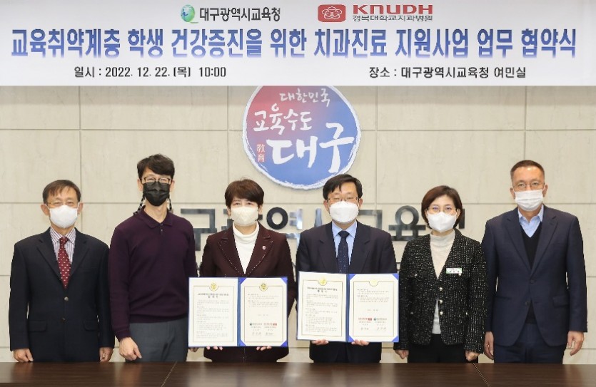 대구시교육청은 지난 22일, 23일 양일간 대구시교육청 여민실에서 교육취약계층 학생 건강증진을 위한 치과진료 및 안경지원 사업 상호협력 강화를 위해 경북대학교치과병원 및 대구보건대학교와 업무 협약을 체결한다고 밝혔다.