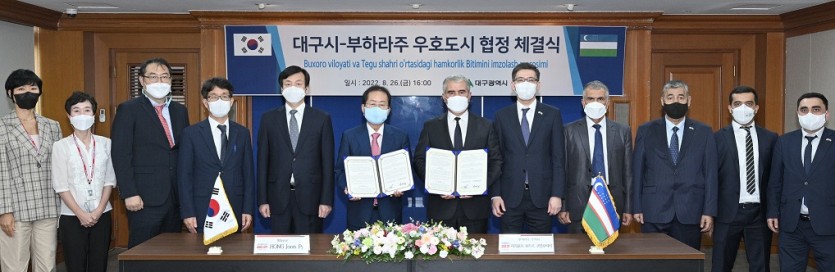 중앙아시아의 신(新)실크로드라 불리는 우즈베키스탄의 부하라주 대표단 일행이 대구시장을 예방하고 대구시와 부하라주 간 우호도시 협정을 체결했다고 26일 밝혔다.