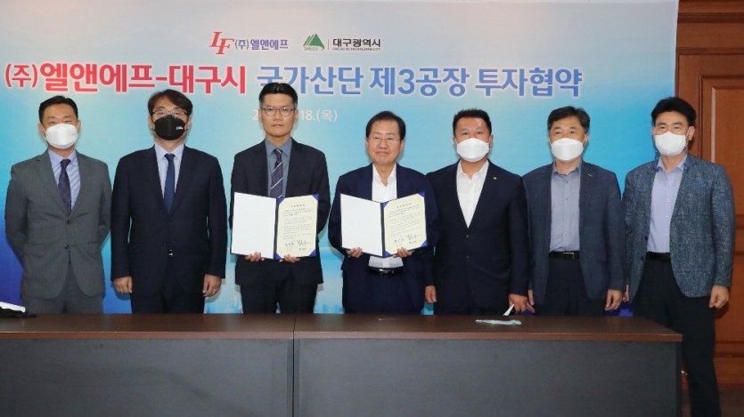 대구시는 18일 산격청사에서 홍준표 대구시장과 최수안 ㈜엘앤에프 대표가 참석한 가운데 대구국가산업단지 제3공장 건립 투자협약(MOU)을 체결했다고 밝혔다.
