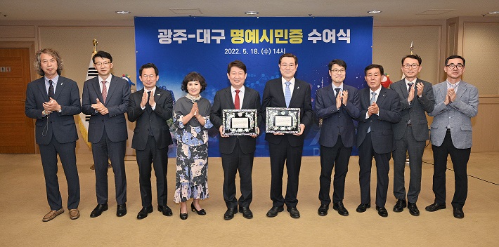 앞서 4월, 대구시는 조례에서 정한 절차에 따라 이용섭 광주시장에 대한 명예시민증 수여 동의안을 의회에서 통과시켰고, 광주시도 5월 초 권영진 시장에게 명예시민증을 수여하는 절차를 마무리했다.