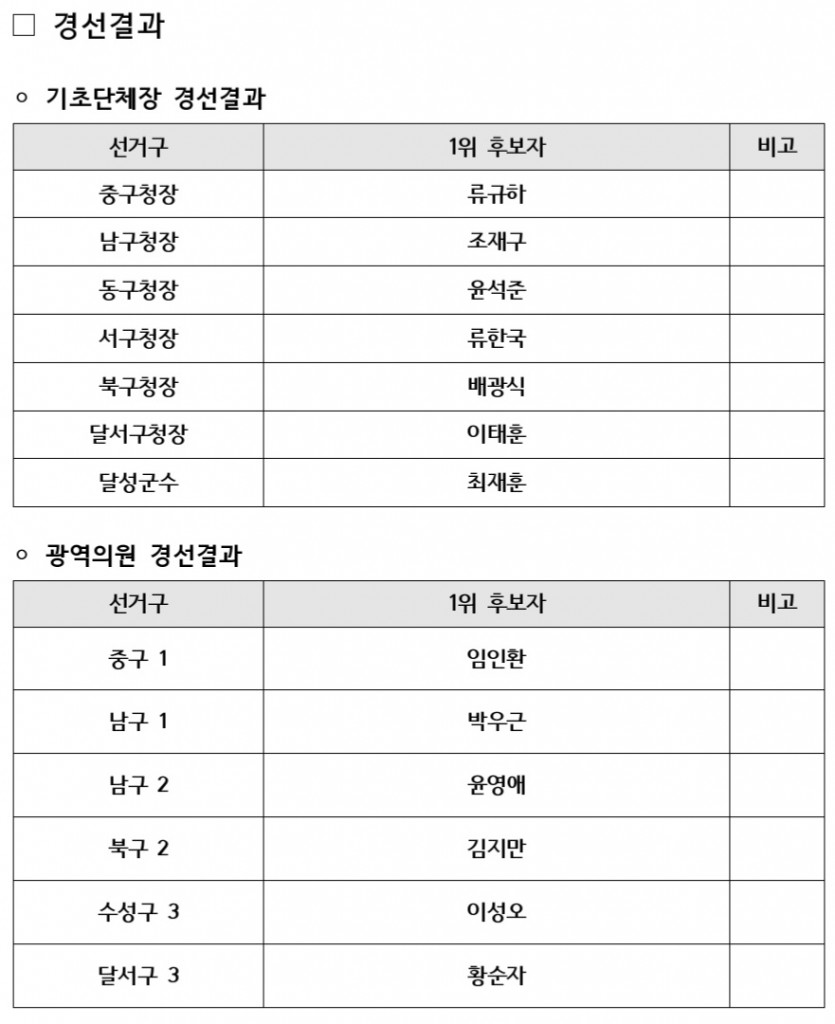 6.1 지방선거 " 국민의힘 대구 기초단체장, 광역의원 경선결과 및 공천자" 발표