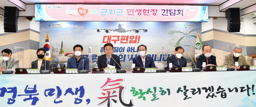 이 자리에서 군위군 대구시 편입과 대구경북 통합신공항 건설을 위한 어려움을 살피고 해결방안을 함께 고민했으며 이철우 지사가 직접 주재한 간담회는 경북도의회의 군위군 대구시 편입안 찬성의결에 대한 군민의 환영 분위기를 반영하듯 감사 인사와 함께 성공적인 통합신공항 건설에 대한 정책건의가 이어졌다.