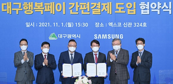 권영진 대구시장과 고동진 삼성전자(주) 대표이사는 1일 엑스코에서 ‘대구행복페이 간편결제 서비스 도입을 위한 업무협약’을 체결했다고 밝혔다.