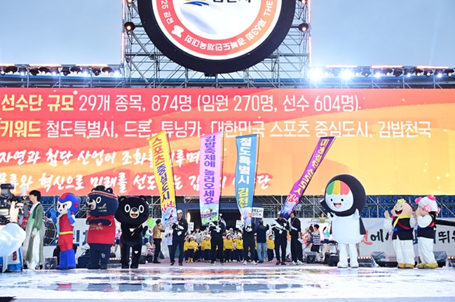 개막식은 김천시립국악단과 국가무형문화재 ‘김천금릉빗내농악’의 합동공연으로 시작됐으며, 산불 피해 지역 위로 영상과 디제잉을 곁들인 선수단 입장 등 이색적인 연출이 더해졌다.