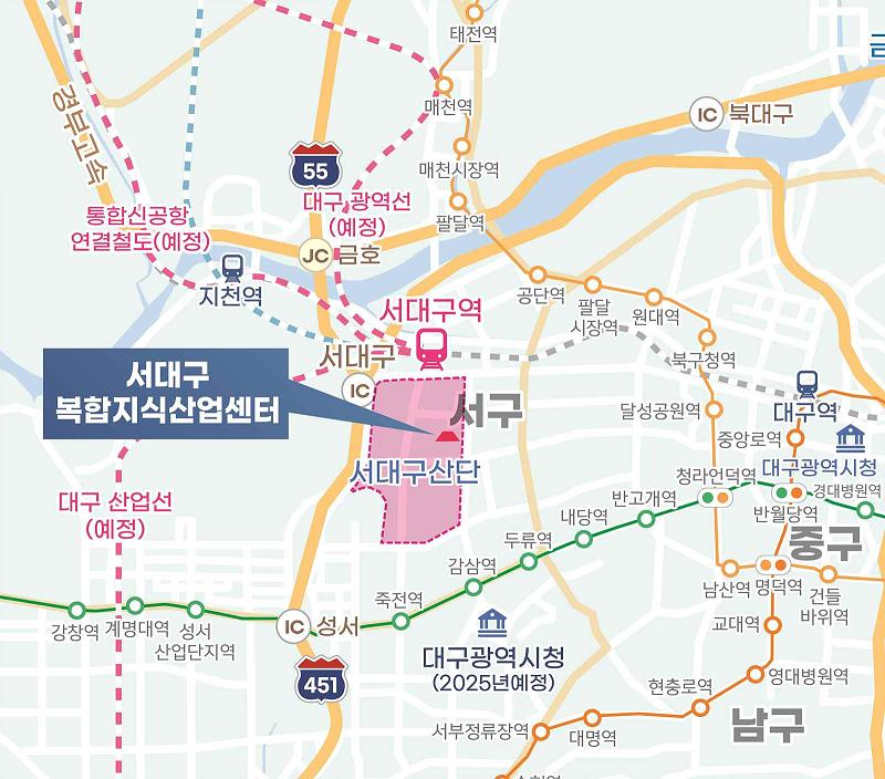서대구 복합지식산업센터는 서대구IC 및 성서IC, 지하철 2호선과 5~10분 거리로 최고의 입지를 자랑하고 있으며 인근에는 2021년 말 개통 예정인 서대구 KTX역이 건설 중이며, 복합환승센터, 첨단벤처밸리, 종합스포츠타운 등 역세권 개발에 따른 신성장 거점지역으로 육성될 계획이다.