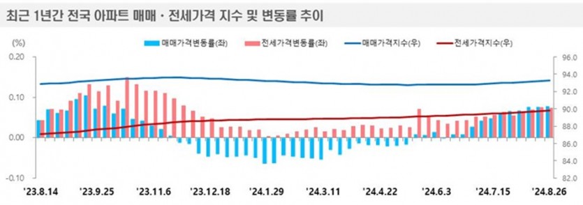 한국부동산원(원장 손태락)이 발표한 2024년 8월 4주(8월 26일 기준) 전국 주간 아파트 가격 동향에 따르면, 매매가격은 0.08% 상승, 전세가격은 0.07% 상승한 것으로 나타났다.
