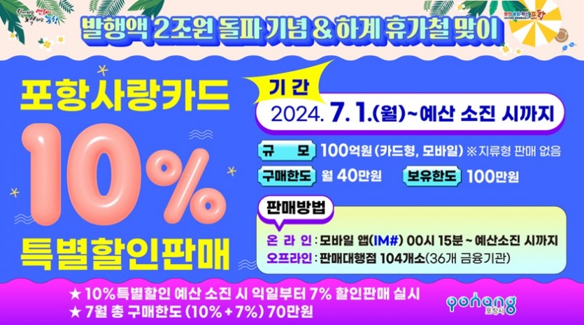 특별할인 판매는 내달 1일 새벽 00시 15분부터 시작되며, 포항사랑카드 모바일 앱을 통해 온라인 판매를 진행하고 있으며 구매자는 판매대행점에서도 충전할 수 있다.