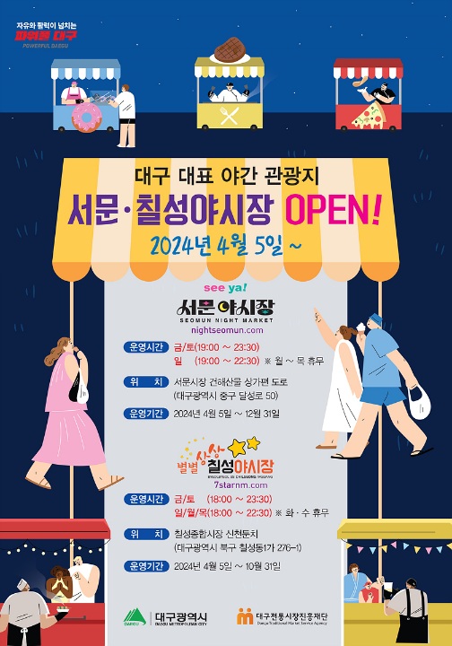대구시와 대구전통시장진흥재단은 다양한 먹거리와 볼거리, 즐길 거리가 가득한 전국 대표 야간 관광명소를 만든다는 목표로 서문·칠성 야시장을 동절기 3개월 휴장기간을 거쳐 오는 5일부터 재개장한다고 밝혔다.
