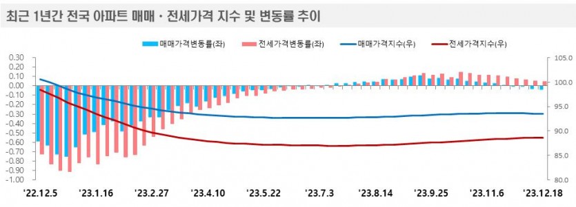 한국부동산원이 발표한 전국 주간 아파트가격 동향 조사 결과, 12월 3주 주간 매매가격은 0.05% 하락, 전세가격은 0.05% 상승했다고 밝혔다.