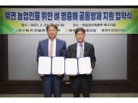 병충해 적기 방제와 영농편의 증진을 위해 3천만 원 지원 예정,한국수력원자력(주) 한울원자력본부(본부장 박범수)는 23일 북면농업협동조합(조합장 어승수)과 ‘북면 농업인을 위한 벼 병충해 공동방제 지원’사업 협약식을 가졌다고 밝혔다.이번 ‘북면 농업인을 위한 벼 병충해 공동방제 지원’사업은 드론 등 무인항공을 활용하여 방제작업을 시행하는 사업이며 이번 지원을 통해 북면지역 농촌 인력 부족 문제 해소와 병충해 예방 등으로 농업 생산성 증대가 기대된다. 어승수 조합장은 “한울본부에서 농업인 농자재 지원에 이어 벼 병충해 공동방…