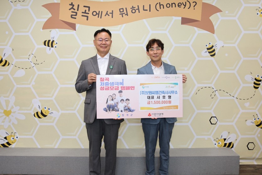 (주)보원씨엠건축사사무소(대표 서호형)가 지난 26일 칠곡군청을 찾아 저출생 극복을 위한 성금 150만원을 칠곡군에 기탁했다.