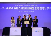 대구 수성구는 24일 지역 내 세계시민교육 활성화를 목표로 유네스코 아시아태평양 국제이해교육원(원장 임현묵)과 세계시민-국제기구 체험관(대구관) 조성을 위한 업무 협약을 체결했다고 밝혔다. 이번 협약은 청소년과 일반 시민을 위한 세계시민교육, 모의유엔총회와 같은 국제기구 진로 체험 등 프로그램을 갖춘 지역관 조성을 골자로 한다.협약식은 김대권 수성구청장, 임현묵 유네스코 아시아태평양 국제이해교육원장 등 관계자가 참석한 가운데 미래 교육 선도를 위해 대구스타디움 서편광장에 새로 조성한 수성미래교육관(S-NEXT)에서 진행됐다…
