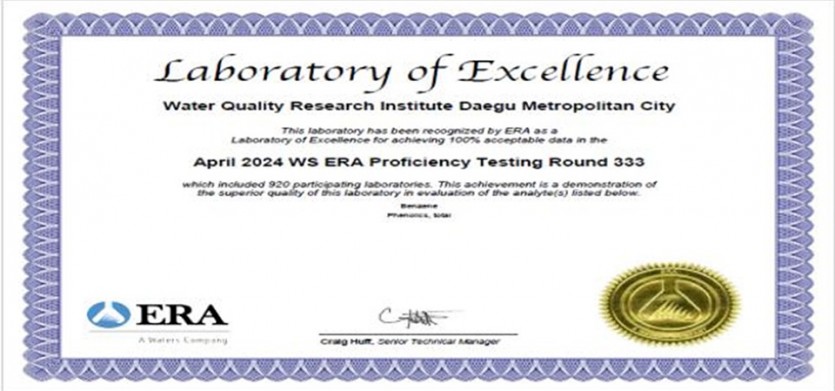 대구시 상수도사업본부 수질연구소는 25일 미국 ERA에서 시행하는 먹는 물 분야 국제숙련도 시험에서 5년 연속 ‘Laboratory of Excellence’를 획득해 세계 최고 수준의 분석 능력을 대외적으로 인정받았다고 밝혔다.