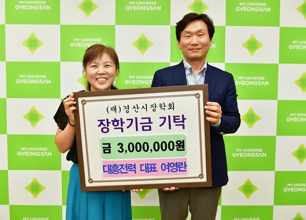 (재)경산시장학회는 대흥전력(주)(옥곡동 소재/ 대표이사 여영란)이 5일 인재 육성을 위한 장학금 3백만원을 기탁했다고 밝혔다.