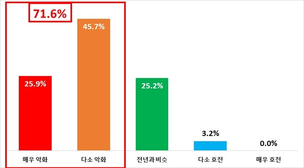 조사에 따르면 응답기업의 71.6%가 지난해 추석보다 체감경기가 나빠졌다고 답했으며 비슷하다는 응답은 25.2%, 좋아졌다는 응답은 3.2%에 불과했다.