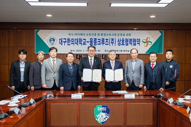 대구한의대학교는 19일 독도 아카데미 교육진흥 및 대학의 평생교육사업 운영을 위한 공동 협력을 도모하기 위해 울릉크루즈(대표 조현덕)와 협약식을 가졌다고 밝혔다.