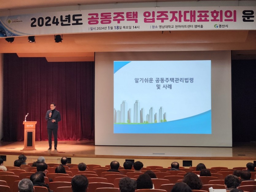 경산시는 18일 영남대학교 천마아트센터 챔버홀에서 경산 지역 내 아파트 입주자대표회의 구성원 200여 명을 대상으로 2024년도 공동주택 입주자대표회의 운영 교육을 했다고 밝혔다.