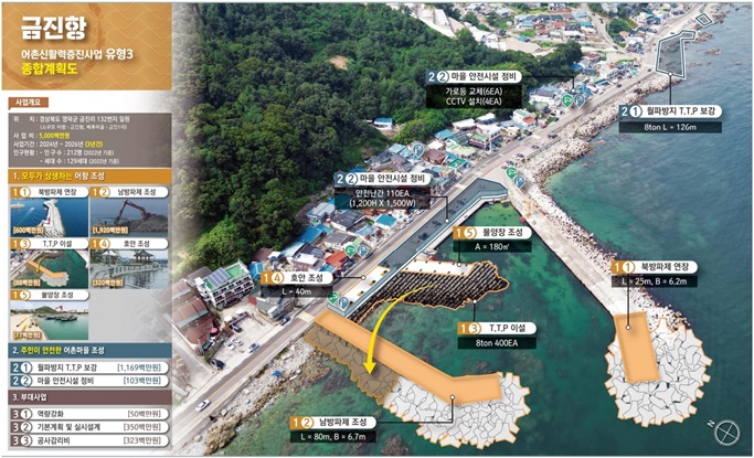 한편 영덕군은 ‘새로운 변화로 밝은 내일을 맞이하는 금진항’이라는 비전으로 어항환경을 개선해 삶의 터전을 확보하고 안전시설을 조생해 주민들의 정주환경을 개선하는 사업을 추진함으로써 모두가 상생하는 안전한 어촌마을을 조성한다는 계획이다.