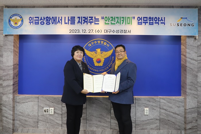 대구수성경찰서는 27일 ‘대구수성경찰서 여성청소년계’에서 이상동기범죄피해자보호·지원을 위해 수성구청과 “안전지키미” 협약식을 진행했다고 밝혔다.