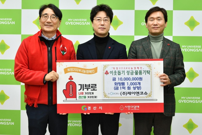 (주)제이앤코슈가 19일 경산시청을 방문해 소외된 이웃을 위한 성금 1천만원과 1억원 상당의 화장품을 기탁했다고 밝혔다.
