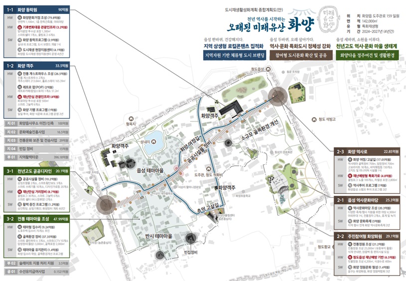 이번 도시재생사업은 화양읍 동상리 58번지 일원 142,000㎡의 부지에 2027년까지 총사업비 269억 원(국비 150, 도비 20, 군비 98, 민간 1)을 투자해 화양 동락원, 화양 객주, 역사문화 마당, 주민참여형 화양화원, 전통 테마 마을 등을 조성한다.