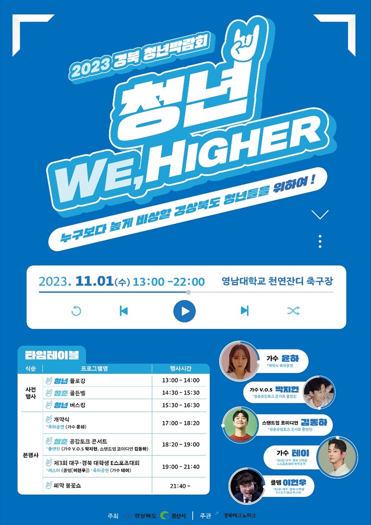 특히 윤하와 테이 등 유명 가수들의 무대와 인플루언서 토크콘서트, 플로깅, 청춘 공감 퀴즈, E-스포츠 대회 등 ‘청년, 위하여(WE HIGHER)'라는 슬로건 아래 다양한 프로그램이 준비돼 있다.