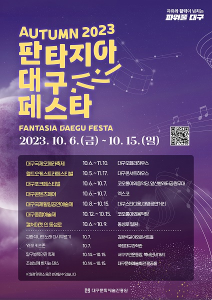 대구시는 오는 10월 6일부터 15일까지 '빛나는 대구, 예술의 향연’이라는 슬로건 아래 다양한 문화예술 행사를 통합한 ‘판타지아대구페스타’ 가을축제를 개최한다고 밝혔다.