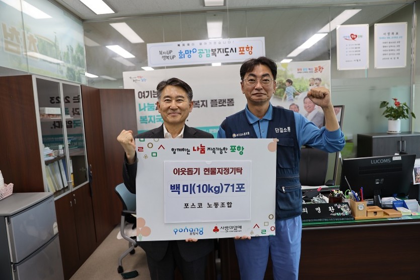 포스코노동조합은 설립 35주년 창립 축하금을 모아 포항시 읍면동 지역 쌀 10kg 71포대를 차상위 계층 및 어려운 이웃에게 전달했다.