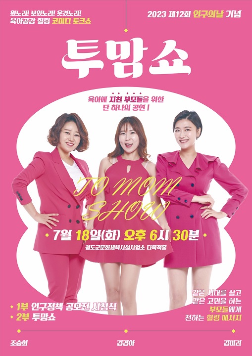한편 시상식은 오는 18일 인구의 날 기념 문화행사에서 진행될 예정으로 1부는 시상식이 열리며, 2부는 김미려, 김경아, 조승희 등이 출연하는 육아공감 코미디 힐링 콘서트‘투맘쇼’ 공연이 이어진다.