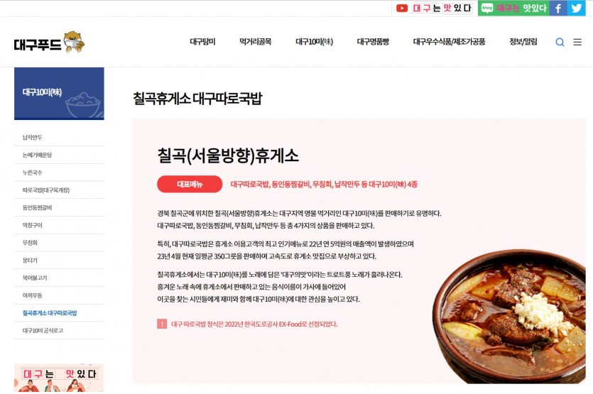 또한, 대구시에서 운영 중인 맛집 사이트인  ‘대구푸드’는 칠곡(서울)휴게소의 ‘대구 따로 국밥’을 추천했다.
