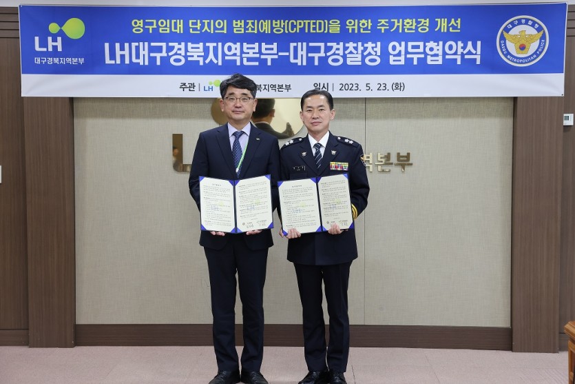 LH 대구경북지역본부는 대구경찰청(김수영 경찰청장)과 LH 임대주택 단지내 셉테드(CPTED) 기반의 생활안심단지 조성과 범죄피해로부터 입주민의 안전 확보를 위한 업무협약을 23일 체결했다고 밝혔다.