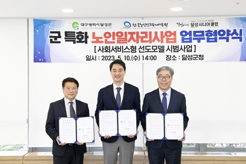 달성군과 한국노인인력개발원은 지난 10일 달성군청에서 "2023년 군특화 노인일자리 사업" 추진을 위해 업무협약을 맺었다고 밝혔다.