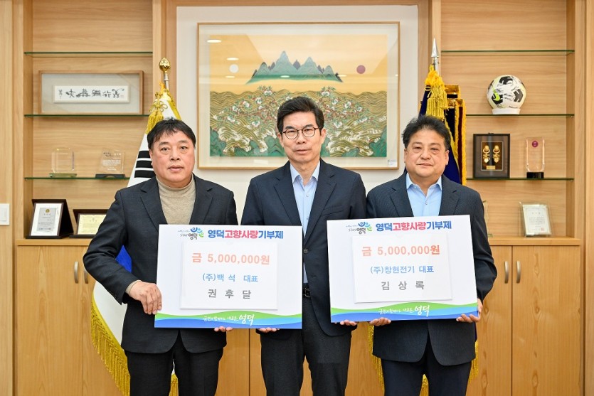 영덕군 출신의 (주)창현전기 김상록 대표와 ㈜백석 권후달 대표가 지난 30일 김열 영덕군수를 만나 각각 고향사랑기부금 500만원을 전달했다고 밝혔다.