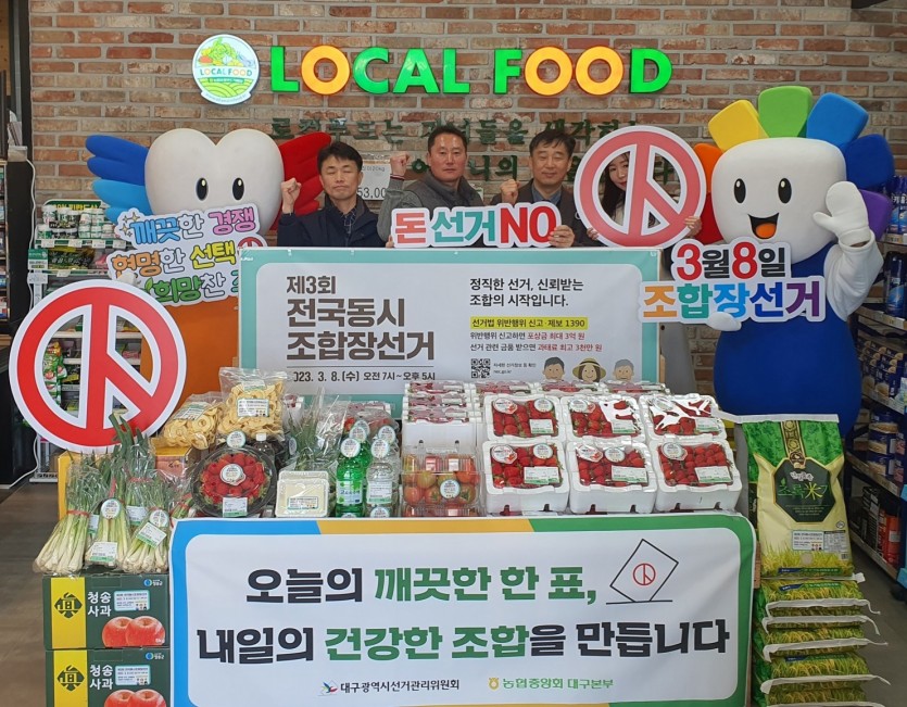 오는 3월 8일 실시하는 제3회 전국동시조합장선거를 앞두고 농협중앙회 대구본부와 함께 가창농협 로컬푸드직매장(달성군 가창면 소재, 이하 ‘가창 로컬푸드’)에서 조합장선거에 대한 조합원들의 관심 제고 및 돈 선거 근절 의식 확산을 위해 실시했다.