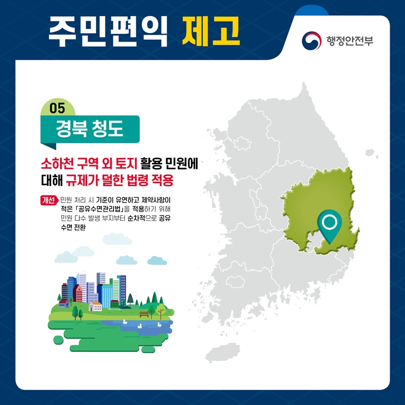 청도군은 최근 행정안전부 주관 ‘2022년 4분기 적극행정을 통한 규제애로 해소사례’(454건) 중, “소하천 구역 외 토지 활용 민원에 대해 규제가 덜한 법령 적용”을 통해 주민 편익 제고에 기여한 우수사례로 선정됐다고 밝혔다.