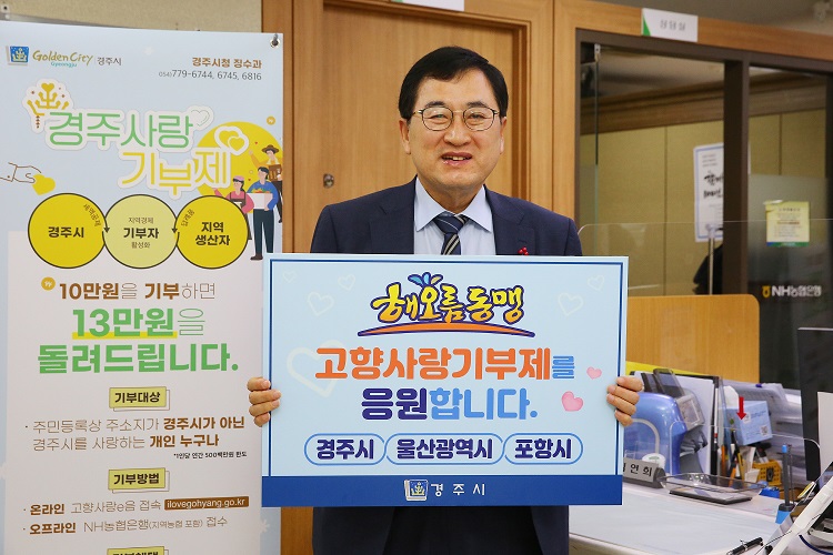 한편 주낙영 경주시장은 “오늘 기부행사를 통해 많은 분들이 고향사랑기부제의 취지에 공감하고 적극 동참하는 계기가 되기를 바란다” 며 “고향사랑기부제를 통해 지방재정 확충과 답례품 제공 등에 따른 지역경제 활성화로 이어지길 기대한다” 고 말했다.