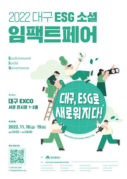 대구시가 주최하고 (사)대구사회적기업협의회가 주관하는 ‘2022 대구ESG소셜임팩트패어’가 오는 18일, 19일 이틀간 엑스코에서 개최된다고 밝혔다.