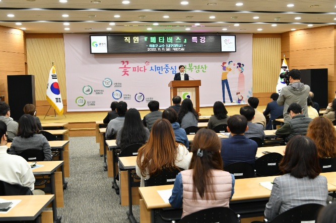 특히 채 교수는 메타버스에 관해 쉽고 재미있는 설명으로 ‘메타버스 경산시장실’ 등 실제 시정에 적용할 수 있는 다양한 행정서비스 아이디어를 제시해 직원들의 큰 호응을 얻었다.