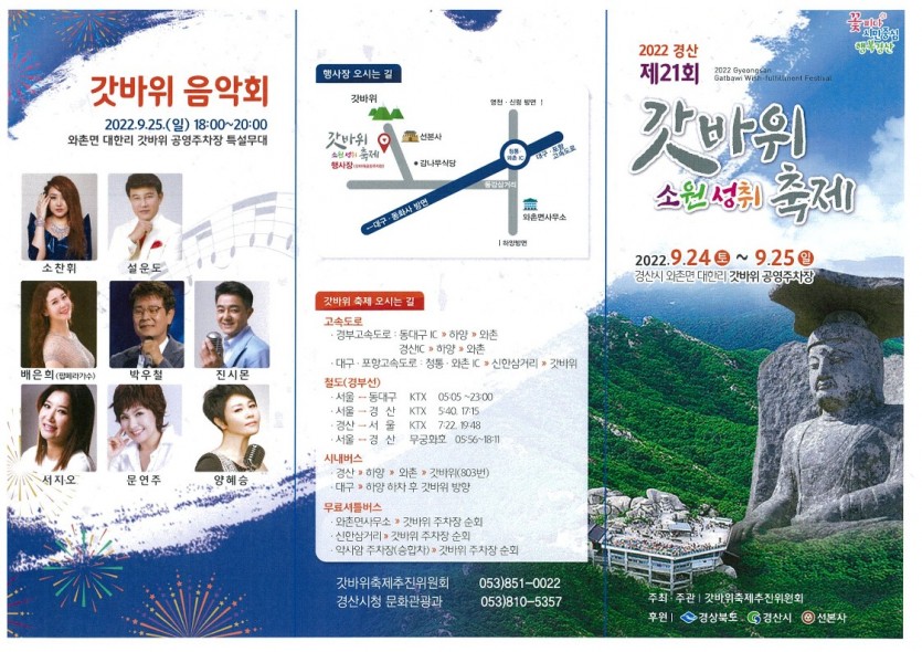 "2022 경산갓바위소원성취축제"는 오는 24일부터 25일까지 경산시 와촌면 대한리 갓바위 공영주차장 일원에서 개최된다고 밝혔다.