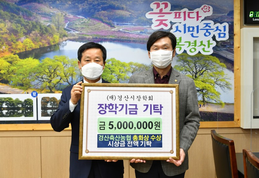 최우수 사무소를 선정하는 농협 최고 권위의 상으로, 경산축산농협이 그 영예를 안게 되어 감개무량하다”고 소감을 밝히며, “이렇게 큰 상을 받을 수 있었던 것은 조합원들과 축협을 이용해 주시는 시민들의 도움이 컸다고 생각해 이 고마움에 보답하고 싶어 장학회에 기탁하게 되었다”며 감사의 인사를 전했다.