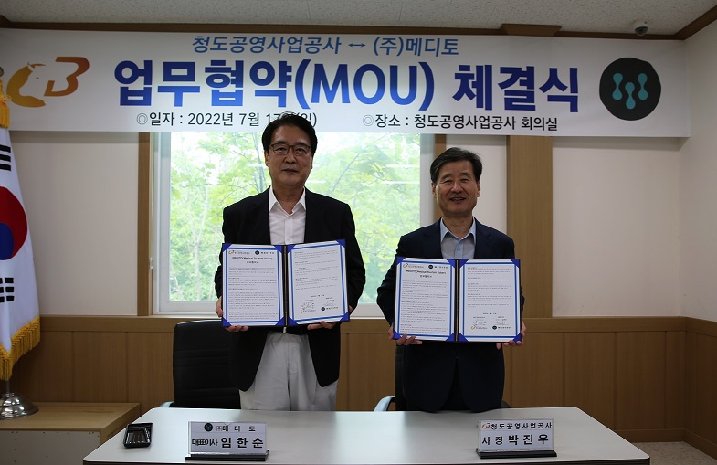 청도공영사업공사는 “㈜메디토와 지난 17일 천혜의 관광자원이 다양한 청정 청도군에 외국인 의료 관광객을 유치하고 지역경제 활성화를 위한 상호 업무협약(MOU)을 체결했다”고 밝혔다.