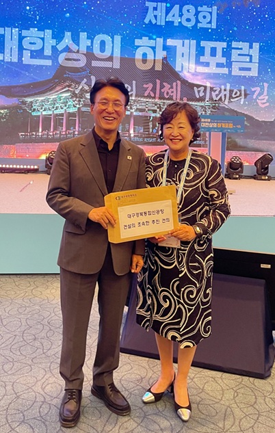 박윤경 대구상의 회장은 16일 경주 라한셀렉트 호텔에서 열린 대한상공회의소 하계포럼에서 김민석 국무총리에게 관련 건의서를 전달했다.