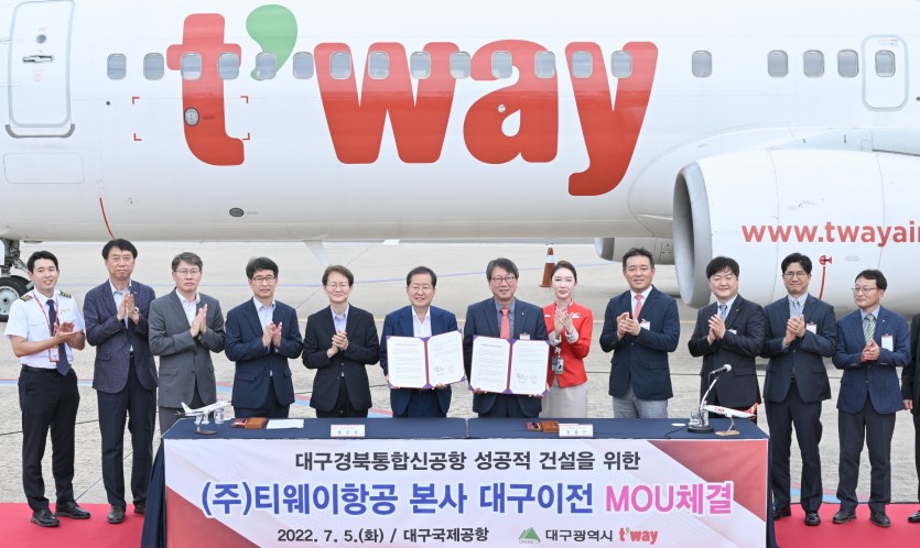 대구시와 ㈜티웨이항공은 5일 대구국제공항에서 항공사의 본사 대구이전, 지역 거점 항공사 육성, 대구경북통합신공항의 성공적인 건설과 지역 경제,산업 활성화 기여에 협력을 위한 업무협약(MOU)을 체결했다.