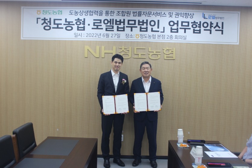 청도농협은 27일 본점 회의실에서 도농상생협력을 통한 조합원 법률자문서비스 지원 및 권익향상을 위해 로엘법무법인과 업무협약을 체결했다.