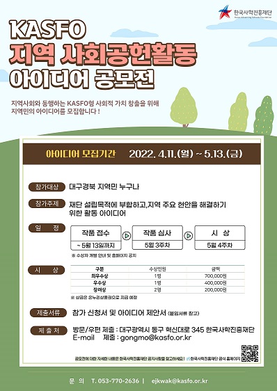 한국사학진흥재단(이사장 홍덕률, 이하 ‘KASFO‘)은 11일, 지역사회 현안 해결을 위한 사회공헌활동 아이디어 공모전을 개최했다고 밝혔다.