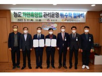 청도군은 지난 17일 청도공영사업공사와 청도자연휴양림 관리운영 위·수탁 협약을 체결했다고 밝혔다.이번 협약식은 청도군에서 조성한 청도자연휴양림을 청도공영사업공사에 위탁해 관리·운영하도록 하는데 있어 필요한 사항을 규정해 원활한 휴양림 운영을 위해 추진됐다.청도공영사업공사는 청도군에서 설립한 지방공기업으로 지난 2011년부터 청도소싸움경기사업을 운영해 레저관광사업에 축적된 역량과 경험을 청도자연휴양림 관리운영에 접목해 휴양림 활성화에 기여할 것으로 기대된다.청도자연휴양림은 산림의 생태·휴양에 대한 체험 제공 및 지역경제 활성화와 저탄…