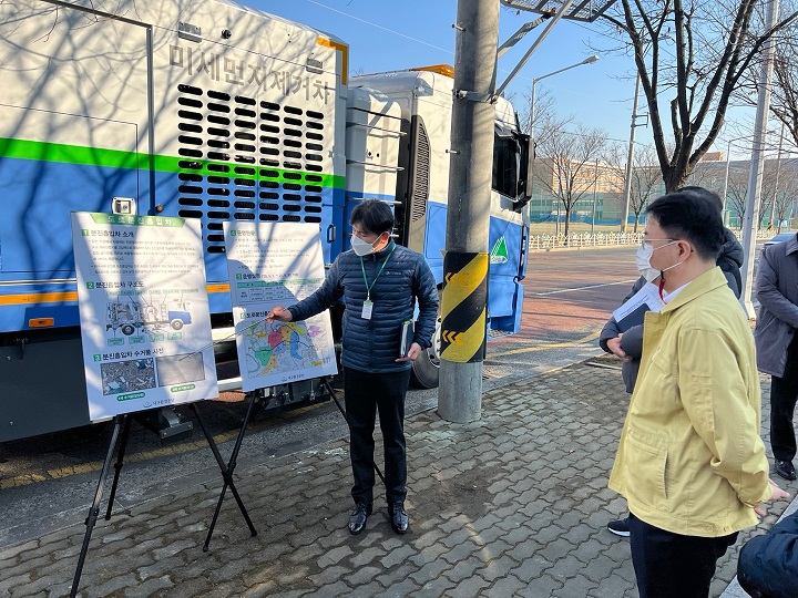 이영석 대구지방환경청장이 7일 오전 집중관리도로 관리 현황에 대한 브리핑을 받고 있으며 대구환경공단 분진흡입차를 탑승해 집중관리도로 점검을 실시하고, 해당 관계자들을 격려하고 있다.