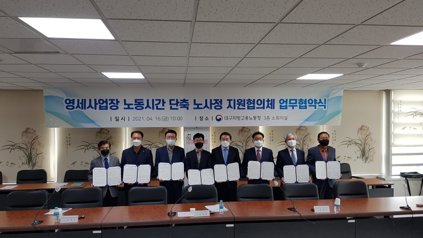 대구지방고용노동청 등 8개 기관은 지난 16일 “영세사업장 노동시간 단축 노사정 지원협의체 업무협약식”을 체결하고 본격적인 활동을 시작한다고 밝혔다.