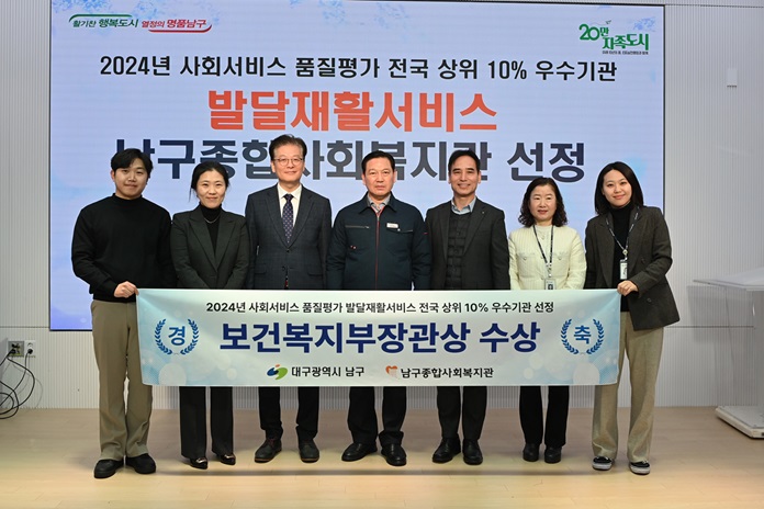 대구남구종합사회복지관이 중앙사회서비스원이 주관한 2024년 사회서비스 품질평가에서 ‘발달재활서비스 A등급 상위 10%’라는 탁월한 성과를 달성해 보건복지부장관상을 수상했다고 밝혔다.