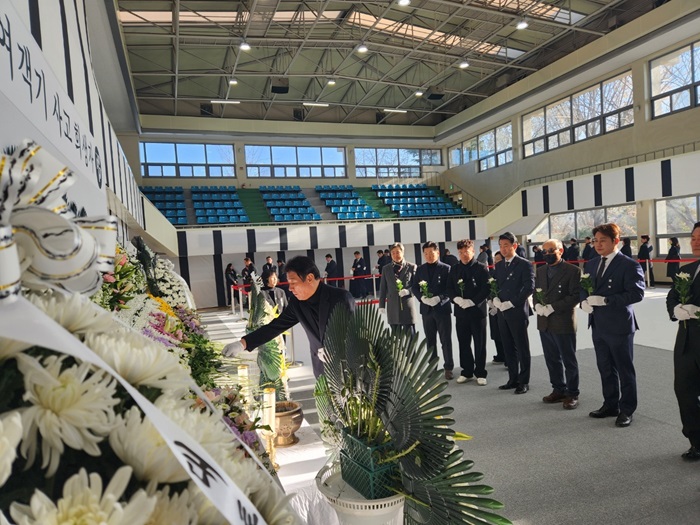 국민의힘 대구시당위원장 강대식 국회의원과 주요 당직자 30여 명이 1일 대구 안병근 올림픽기념유도관에 마련된 제주항공 여객기 사고 희생자 합동분향소를 찾아 희생자들을 추모했다.